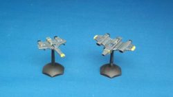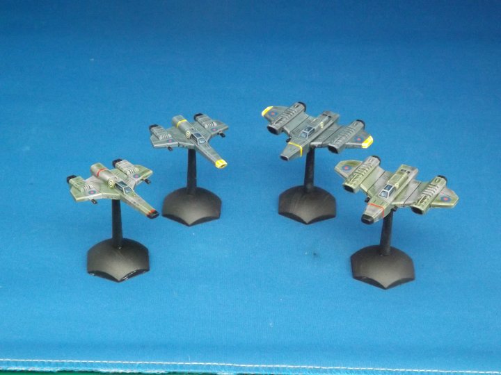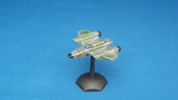 So it’s time we added some new models, and today we have two British fighters. Both are scaled up from their tiny counterparts in the spaceship range, although a simple scale-up of the smaller versions just wouldn’t work – some details would be too big, wings would be too thick, they really just wouldn’t look right. So I’ve redesigned them from scratch so that everything works in 1/300th. I’ve also had a bit of fun painting some retro RAF colour schemes using markings from Dom’s Decals.