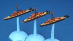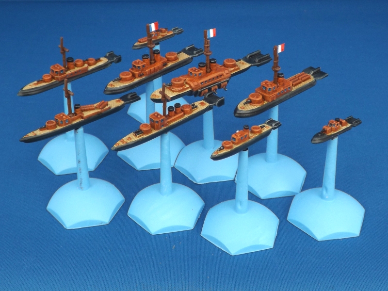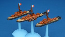 Today’s batch of new models includes two destroyers, three frigates, three patrol craft and a monitor. The smaller vessels are one piece castings with separate masts where appropriate, while the three largest vessels have separate gun turrets and (in the case of the Suffren monitor) side guns. The patrol craft are now supplied as a sprue of three vessels instead of singly.