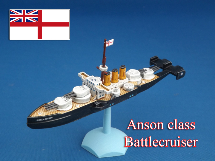 We’re starting today with a new Aeronef model, the British Anson class Battlecruiser. It’s comes in at an impressive 110mm long, as large as an Albert class Dreadnought although not as hefty. She mounts two triple turrets and a pair of superfiring twin turrets, along with a more than respectable secondary battery, and boasts an impressive turn of speed for a vessel her size. In Aeronef however, she does suffer from the “There Seems To Be Something Wrong With Our Bloody Ships !” optional special rule.
