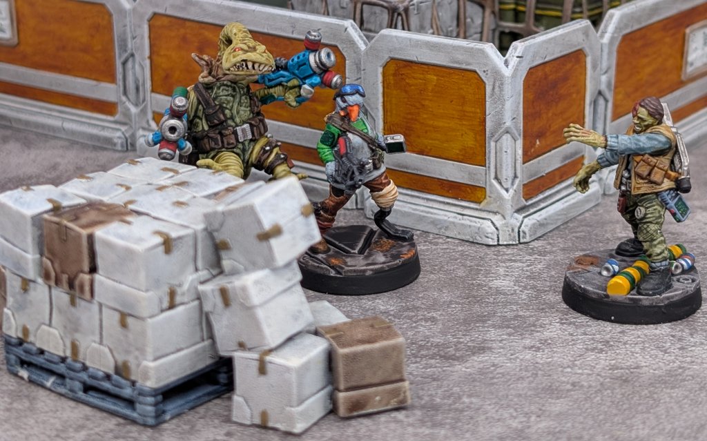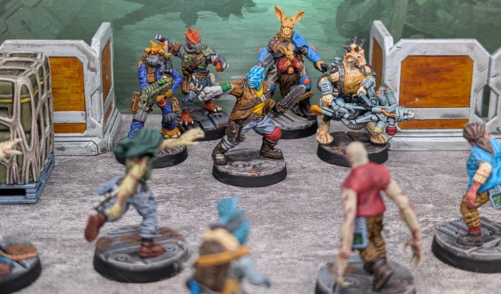 With a solid CLANG! the Maverick docked with the station. With assorted clanks, rumbles and hisses the two systems connected, then the red lights above the lock cycled to green. The doors opened to the interior of the airlock, past the already open inner portal and then onto the station corridor. Ahead of them, the crew saw the backs of a number of what must have been station personnel. The figures turned to face the noise of the opening airlock – but there was something wrong. All of them were disfigured and, well, wrong. Their skin was discoloured and covered with sores and blisters, and many had weirdly misshapen limbs. The closest of them, a female with strangely green hair, opened her mouth to reveal a set of what could only be described as fangs, and hissed.