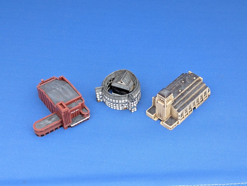 The latest additions to our 1/1000th scale Small Scale Scenery range are this trio of buildings aimed at providing entertainment and relaxation to the general population. The most distinctive and recognisable is our circular Medieval Theatre, based on the Globe Theatre, famous for putting on the plays of William Shakespeare. The original was built in 1599, then burnt down in a theatrical accident involving a stage cannon in 1613 (!). Hastily rebuilt, the second Globe remained open until ~1644 when it was pulled down to make way for tenements. Our version is based on the modern day reconstruction which opened in 1997, which has been built as closely as possible to the originals based on available evidence.