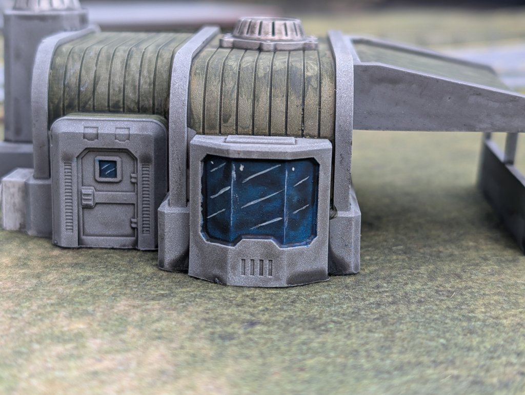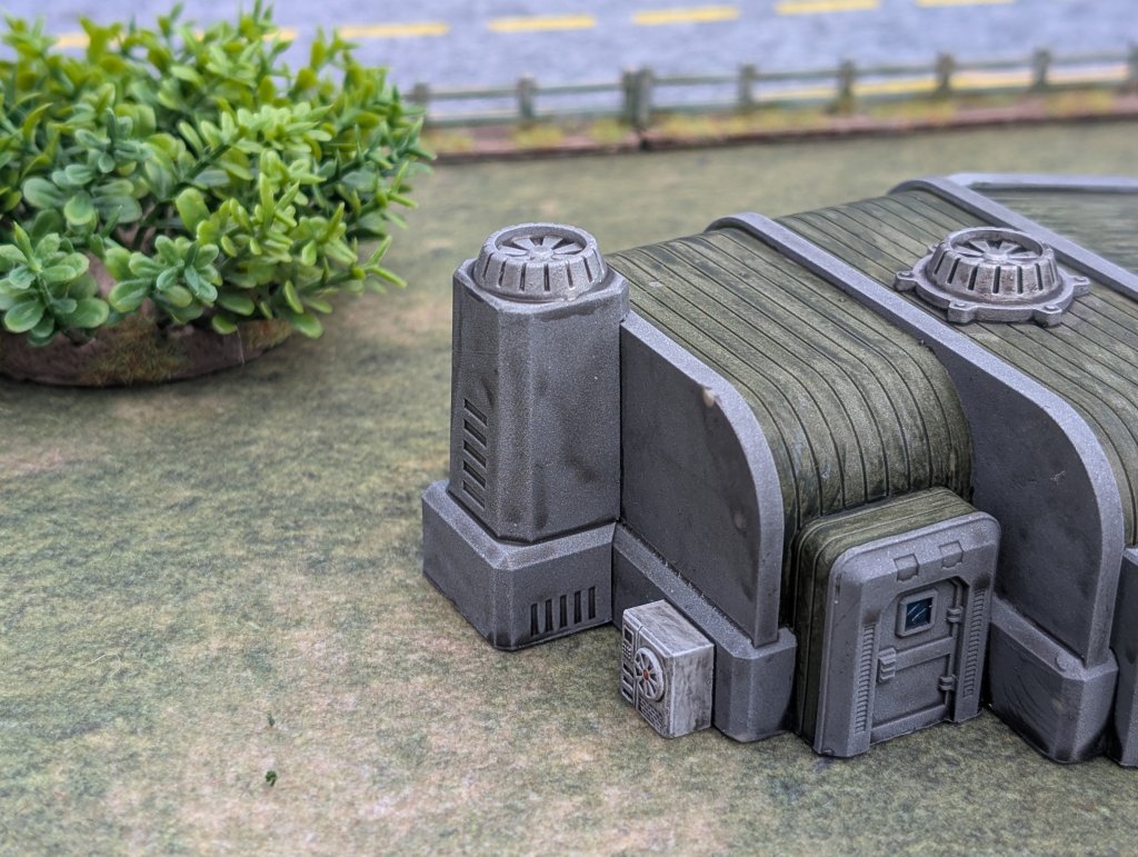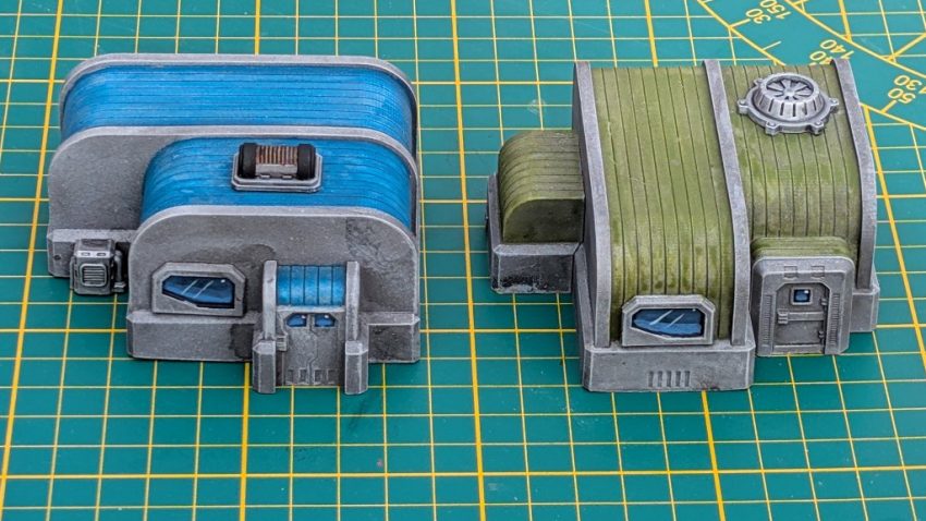 Today we’re focussing on the 15mm versions. These are different to the smaller models in that they’re designed to be modular; the base buildings are just blank shells, and all of the external features – doors, windows, aircon, vents etc – are separate pieces, allowing you to position them wherever you like. This makes for a surprising amount of variation – the two buildings pictured below are made from exactly the same building shell, but with a different arrangement of features.