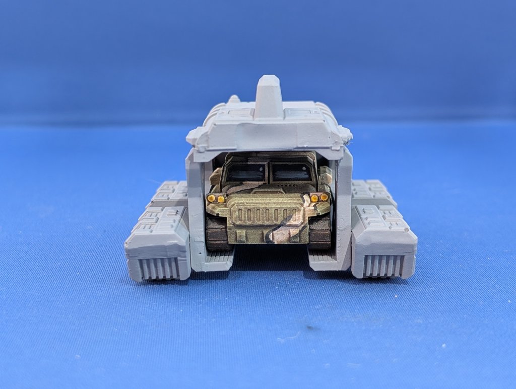 Rear view with Polevka tracked jeep onboard