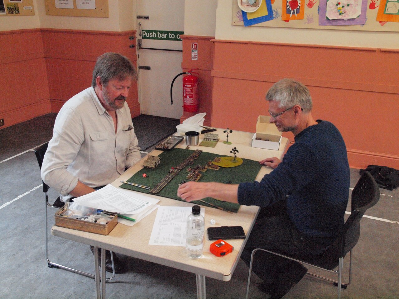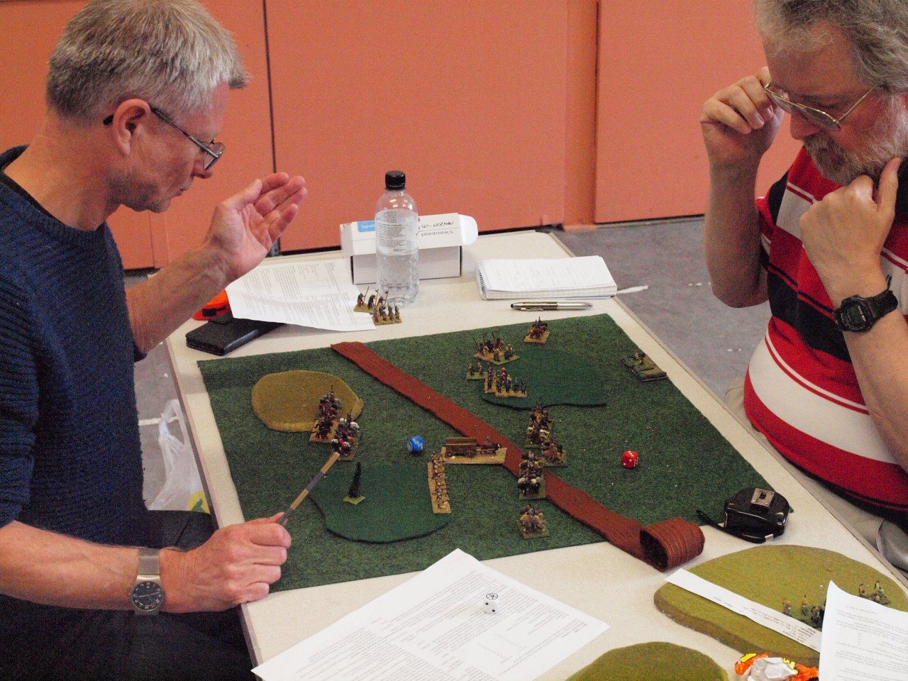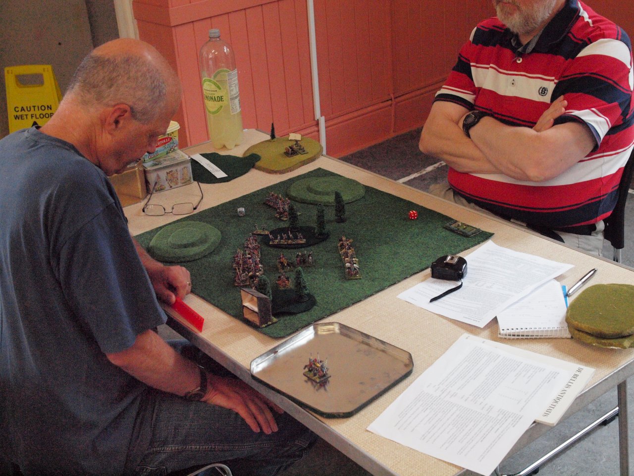 A short round meant Mike missed out on points (if a game doesn’t finish before time is up then players get points for elements killed but no winning point). Paul Lymath and Andy had wins and the top of the table was starting to look crowded with no obvious pull-away lead. It would stay like that most of the day, with final victory possibly going to any one of three players. Paul French was faced with a dilemma in his game with Andy – whether to mass his artillery in one grand battery or not. He did and he was rewarded with a splendid victory.